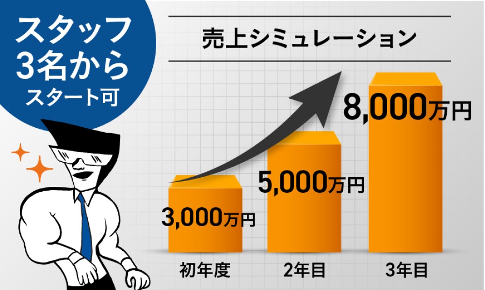 事業は3名から開始し、事業成長にあわせて人員増加していただくことで、より高い成長性が期待できます。