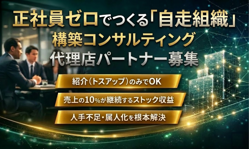 中小企業の経営者が抱える「人手不足」と「属人化」という深い悩みを根本解決する、「資産型・自走組織」構築コンサルティングの代理店募集です。